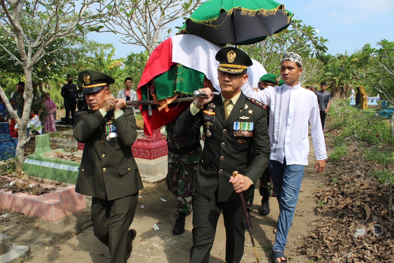 OKI – dinastinews.com – Minggu (5/6/2022) – Komandan Kodim 0402/OKI, Letkol Inf Hendra Saputra, S.Sos.,M.M.,M.I.Pol memimpin upacara pemakaman jenazah Almarhum Serda Nopriansyah, anggota Kodim 0402/OKI yang meninggal karena sakit. Prosesi upacara pemakaman secara militer di tempat pemakaman umum Desa Purnajaya, Kecamatan Indralaya Utara, Kabupaten Ogan Ilir.