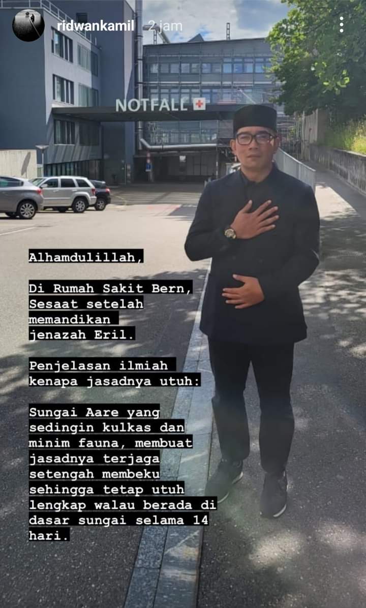 “MASYA ALLAH, Walau sudah lewat 14 hari, jasadnya masih utuh, lengkap tidak kurang satu apapun, wajah rapih menengok ke kanan dan saya bersaksi, jasad Eril wangi seperti wangi daun eucalyptus. Sungguh mukjizat kecil yang sangat kami syukuri,” tulis Kang Emil dalam postingan instagramnya.