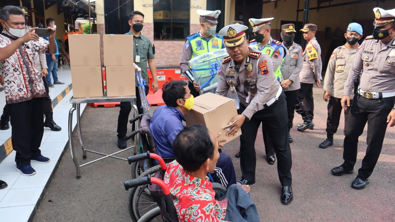Kegiatan baksos tersebut diisi beberapa kegiatan yang diantaranya seperti pemberian alat bantu jalan, pemberian paket sembako dan pembagian helm yang dilakukan di Halaman Mapolres Tegal, Kamis 16 Juni 2022.
