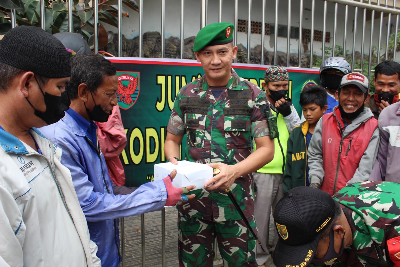 OKI – dinastinews.com – Jum’at (17/06/2022) – Dandim 0402/OKI Letkol Inf Hendra Saputra,S.Sos.,M.M.,M.I.Pol bersama anggota Kodim membagikan ratusan nasi kotak kepada pengguna sepeda motor, becak dan Ojek, kegiatan bakti sosial dalam rangka Jumat berkah ini dilaksanakan di pasar tradisional Kayuagung, Kota Kayuagung.