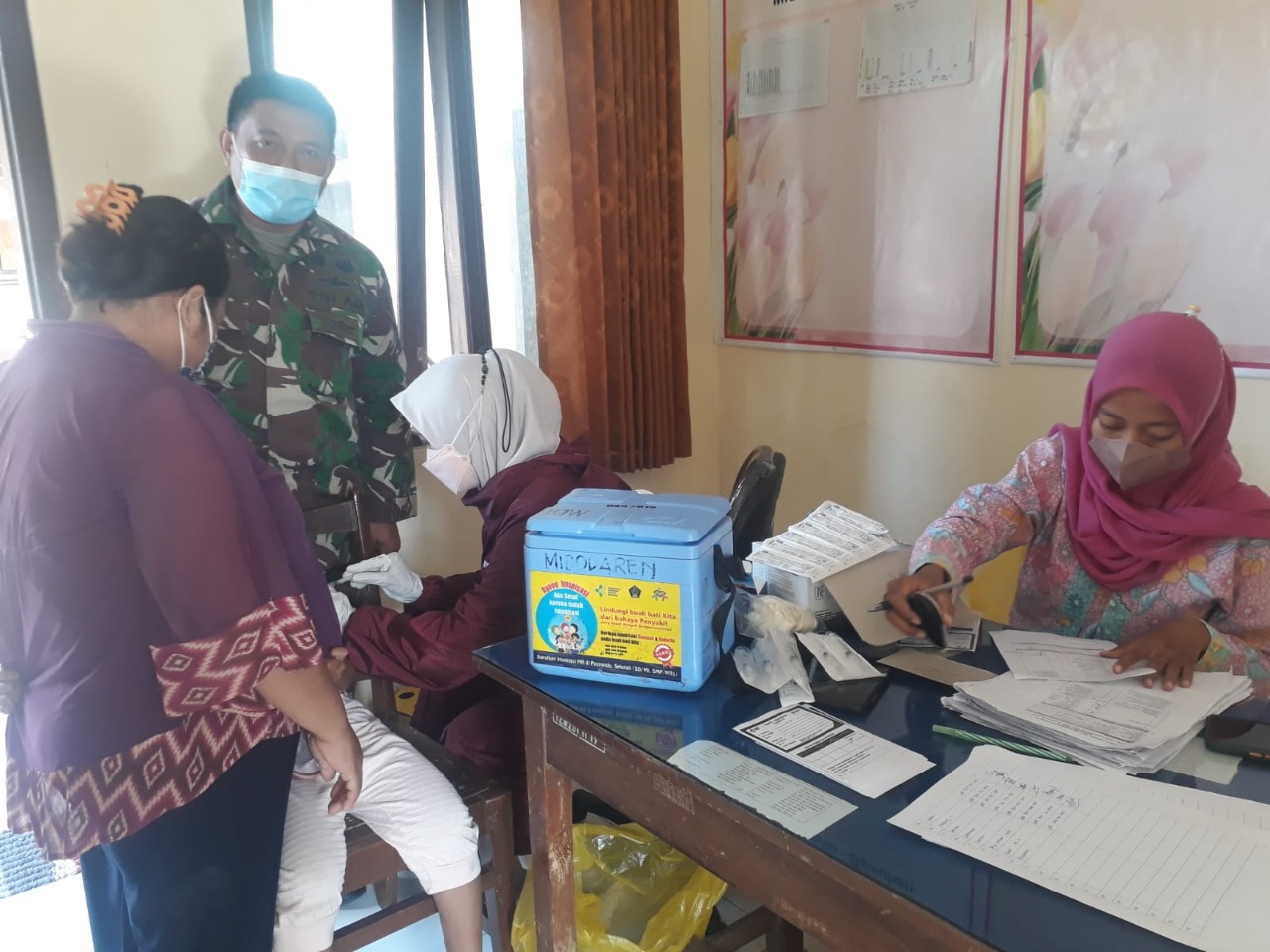 Dinastinews.com Blitar — Untuk memberikan rasa nyaman dan aman, serta untuk memastikan kegiatan berjalan lancar, Babinsa Koramil Tipe B 0808/10 Kademangan Kodim 0808/Blitar, Serda Fanda Yudianto melaksanakan kegiatan pendampingan vaksinasi Covid-19 dosis ke 2 dan vaksinasi booster, terhadap warga binaannya, di Pustu Midodaren Desa Dawuhan Kecamatan Kademangan Kab. Blitar, Kamis (30/6/2022).