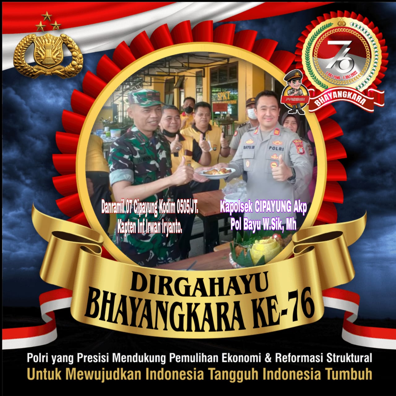 Danramil 07/Cipayung Kapten Inf Irwan Iryanto Pimpin langsung kegiatan pemberian Nasi tumpeng Ulang Tahun serta ucapan selamat Hari Bhayangkara ke 76, “Polri yang presisi mendukung pemulihan ekonomi dan reformasi struktural untuk mewujudkan Indonesia tangguh, Indonesia tumbuh”.