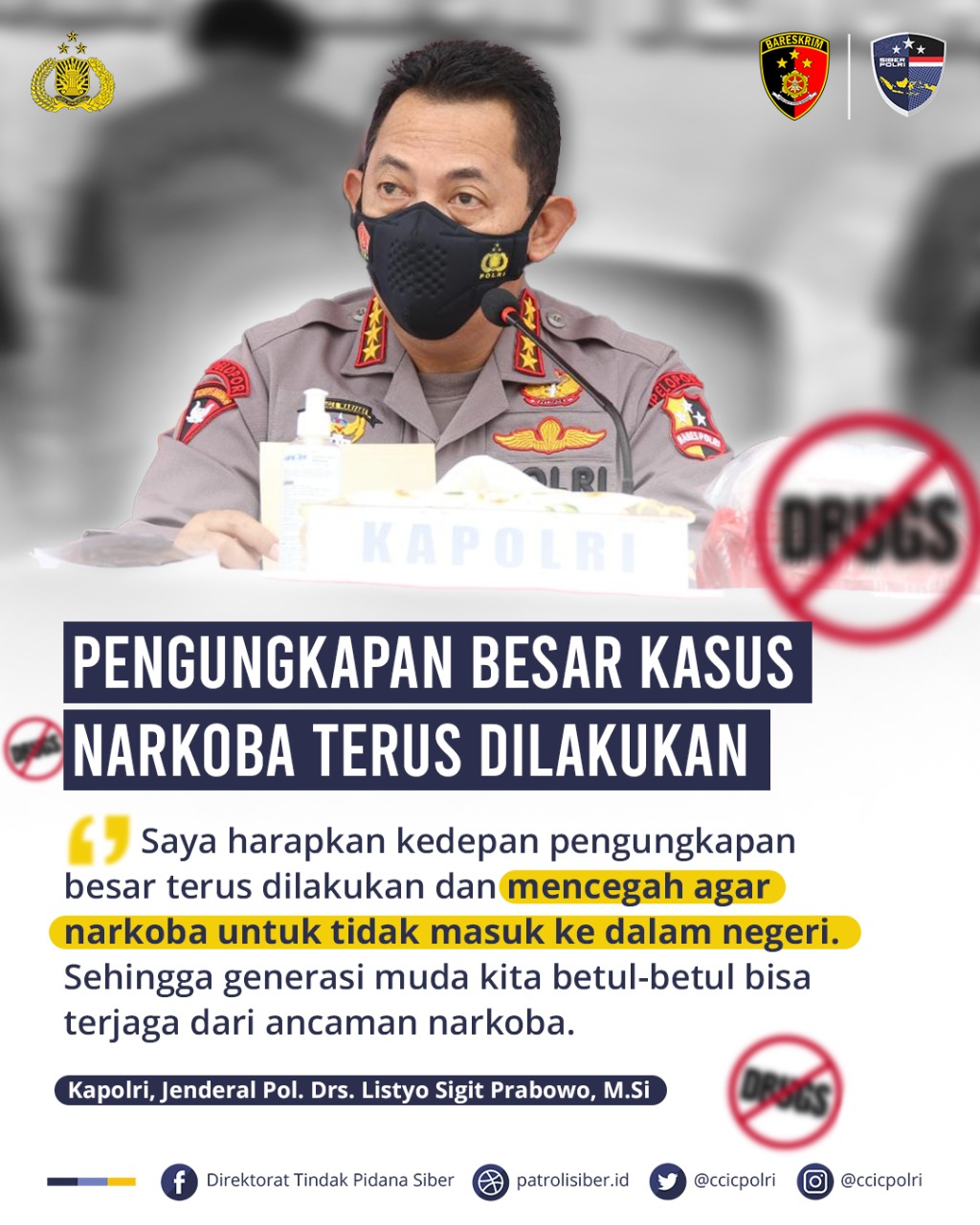 Kapolri Jenderal Polisi Drs. Listyo Sigit Prabowo juga mengapresiasi atas prestasi jajaran nya yang telah mengungkap dan menggagalkan peredaran narkoba secara ilegal baru baru ini, seperti pada tanggal 12/06/2022 Dittipidnarkoba Bareskrim Mabes Polri berhasil menggagalkan upaya peredaran narkoba jenis Ganja seberat 130 Kg jaringan Aceh – Lampung – Jawa Barat. Dan juga pada tanggal 28/04/2022 kemarin tim satgasus dan direktorat IV narkoba Mabes Polri membongkar jaringan 2,5 ton Sabu Aceh – Jakarta.