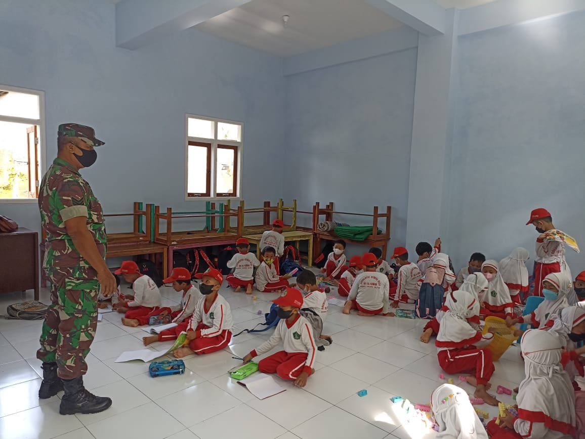 Dinastinews.com Blitar — Babinsa Koramil Tipe B 0808/12 Wlingi Kodim 0808/Blitar, Serka Tito Lesmono melaksanakan pemantauan kegiatan Pembelajaran Tatap Muka (PTM) secara langsung di TK Dewi Sartika 01 Balerejo Kec. Wlingi Kab. Blitar, Jumat (22/7/2022).