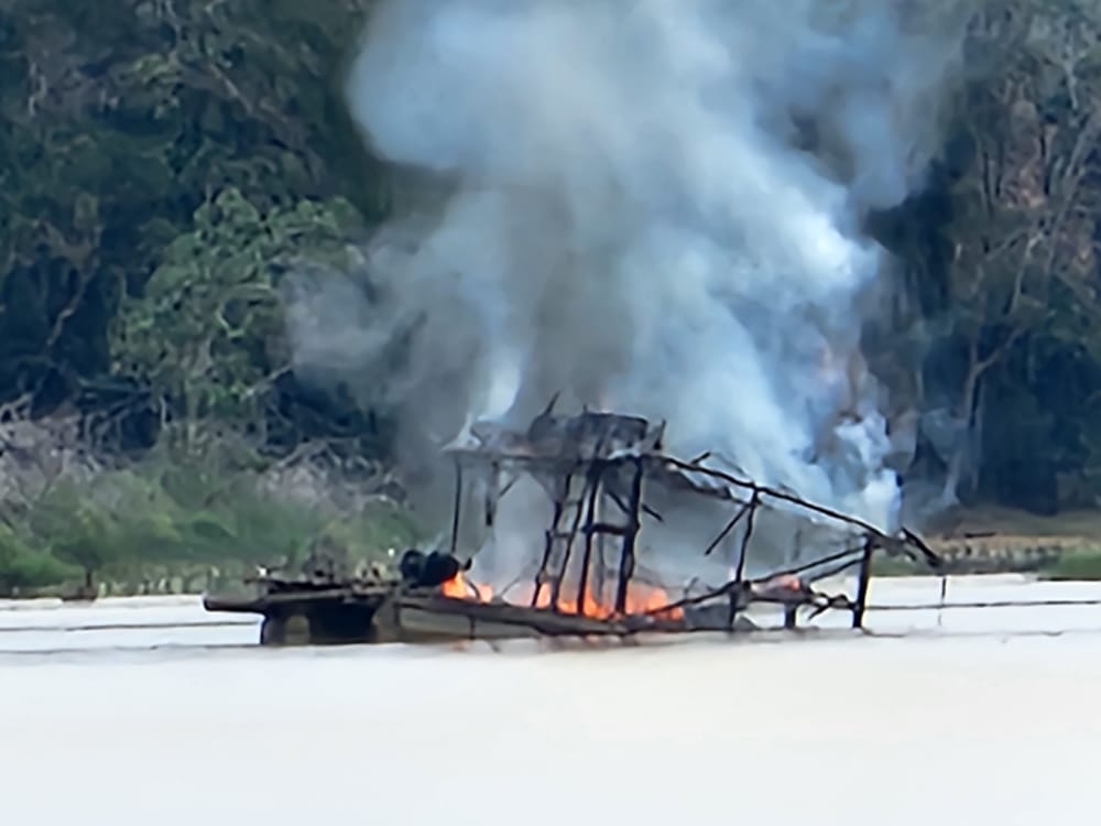 Pendindakan aktivitas PETI tersebut ditemukan 5 (Lima ) unit Rakit Dompeng yang telah ditinggalkan oleh para pekerja, selanjutnya dilakukan tindakan 2 ( dua) rakit Dompeng di rusak dan di tenggelamkan dengan cara menggunakan Mesin Pemotong “chainsaw” dan 3 (tiga) unit Dompeng rakit dengan cara di bakar agar tidak dapat dipergunakan kembali.