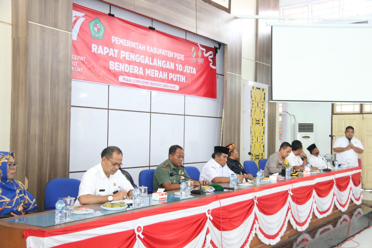 Dinastinews.com Aceh | Kabupaten Pidie — Dalam rangka menyemarakkan HUT ke. 77 RI di Kabupaten Pidie. Berbagai persiapanpun dilakukan Pemkab, ditandai dengan rapat koordinasi yang dilaksanakan oleh Pj. Bupati Pidie bersama unsur Forkopimda, Rabu (03/08/2022) di Oproom Setdakab Pidie. Salah satu agenda persiapan pelaksanaan HUT ke. 77 RI di Kabupaten Pidie, adalah penggalangan 10 Juta Bendera Merah Putih, yang nantinya akan dikibarkan seantero Pidie.