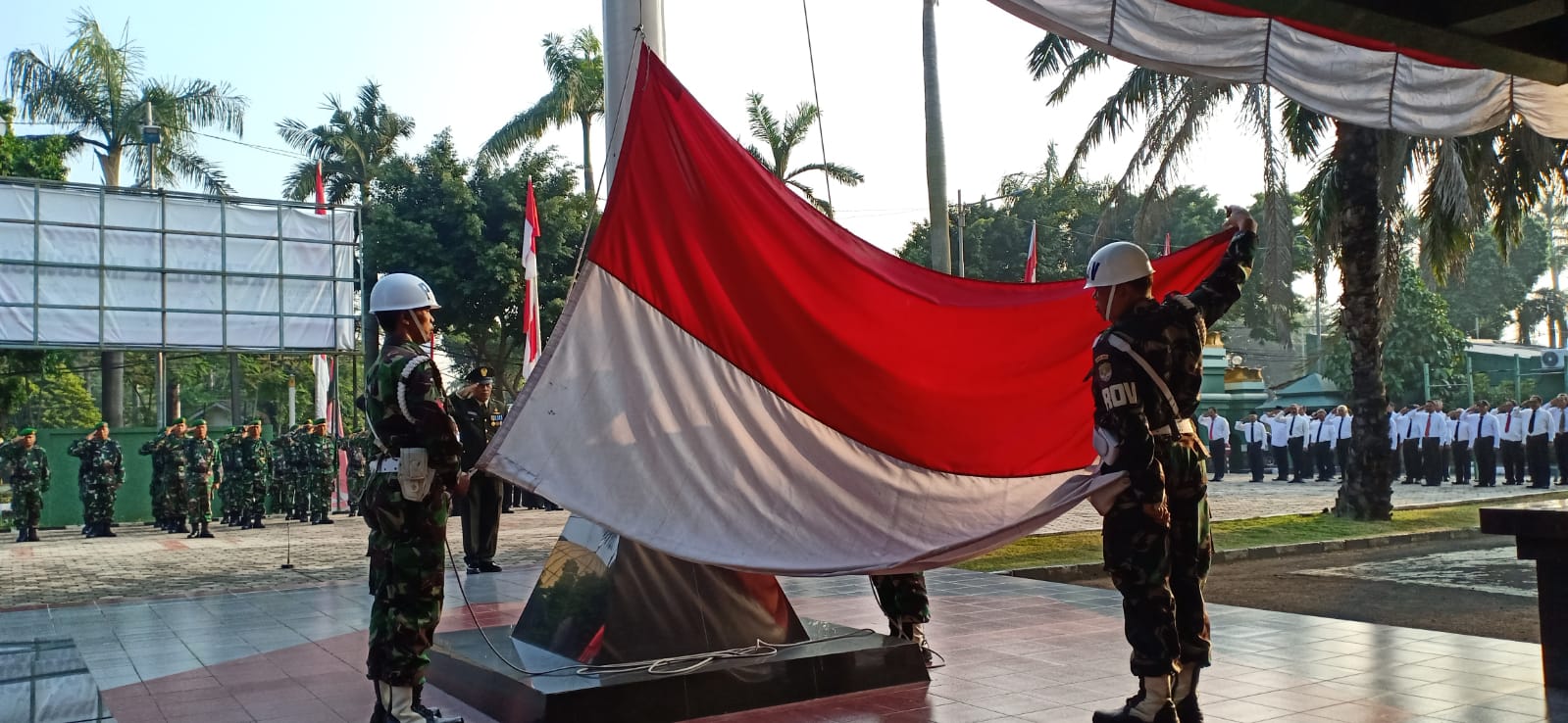 Upacara memperingati HUT Kemerdekaan Republik Indonesia ke 77 yang di ikuti oleh seluruh anggota TNI, PNS, Mitra dan FKPPI jajaran Kodim 0505/JT.