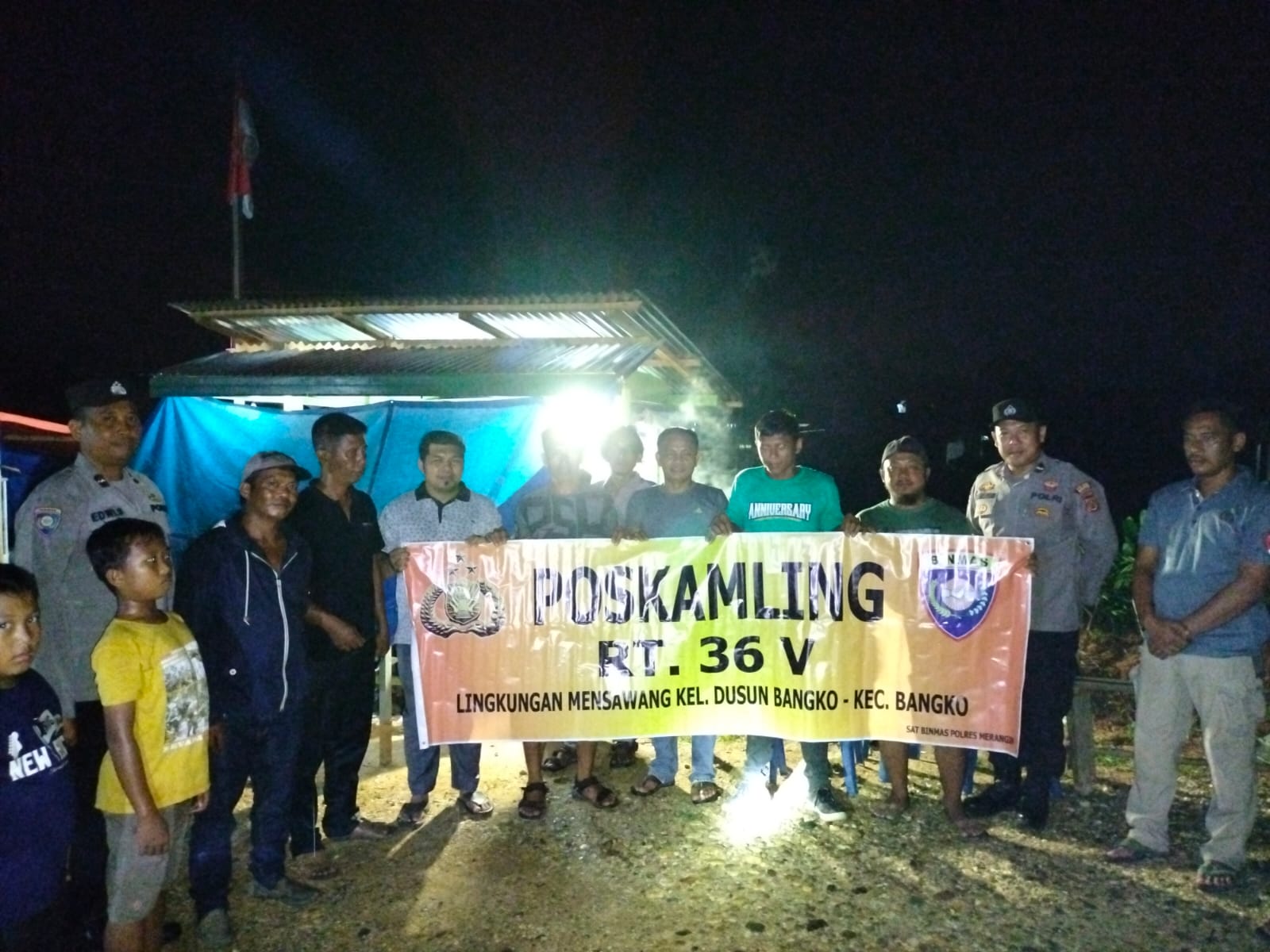 Kanit Binpolmas Sat binmas polres merangin Aipda. Marwi Hasan.SH , beserta Aipda. Edwi Santoso dan Bripka Troy lois.SE melaksanakan kegiatan pembinaan Poskamling RT 36 lingkungan Mensawan Kelurahan Dusun Bangko Kecamtan Bangko dan memberikan sarana kontak kelengkapan poskamling berupa senter dan spanduk.