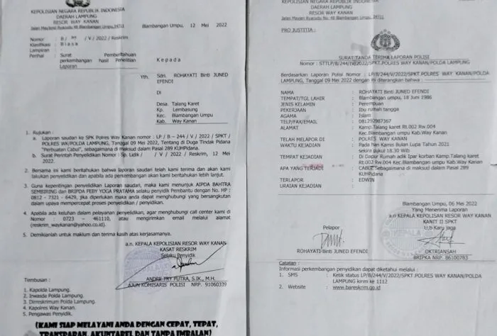 Way Kanan,Lampung Dinastinews.com– Yth. Bapak Kapolda Lampung, laporan polisi yang disampaikan seorang wanita berinisial RH ke Polres Way Kanan terkesan jalan di tempat alias tidak ditindak-lanjuti. RH yang merupakan ibu rumah tangga, warga Kampung Talang Karet, RT.002/RW.004, Kecamatan Blambangan Umpu, Kabupaten Way Kanan, Provinsi Lampung, diduga kuat telah menjadi korban perbuatan cabul yang dilakukan oleh oknum pegawai Perusahaan Jawatan Kereta Api (PJKA) Resor Jalan Rel 10 BBU, berinisial ED. Peristiwa pelecehan seksual yang menimpa korban RH tersebut telah dilaporkan ke Polres Way Kanan pada hari Senin, 06 Mei 2022, sesuai dengan Surat Tanda Terima Laporan Polisi Nomor: STTLP/B/244/IV/2022/SPKT.POLRES WAY KANAN/POLDA LAMPUNG Dinstinews Pada Minggu 04 September 2022.