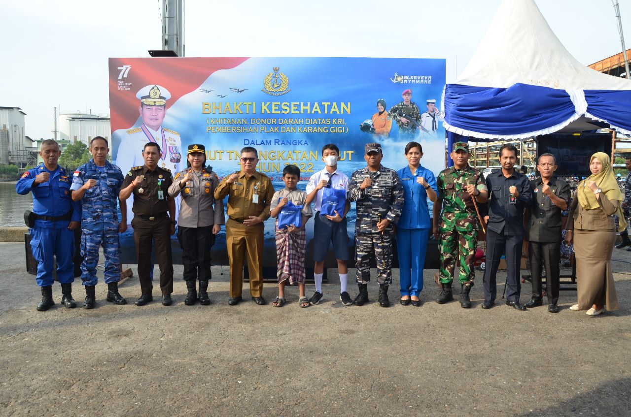 Dinastinews.com Dumai —Komandan Lanal Dumai Kolonel Laut (P) Stanley Lekahena, M.Tr. Hanla., didampingi Ibu Ketua Jalasenastri Cabang 4 Korcab I DJA I Ny. Sandra Stanley melaksanakan Bhakti Kesehatan (Khitanan, Donor Darah diatas KRI, Pembersihan Plak dan Karang Gigi) dalam rangka HUT TNI Angkatan Laut Tahun 2022 yang dipimpin langsung oleh Kepala Staf Angkatan Laut (Kasal) Laksamana TNI Yudo Margono dari KRI Semarang-594 di Perairan Pulau Untung Jawa dan diikuti secara virtual melalui zoom meeting dari Dermaga C Pelindo Dumai, Jalan Datuk Laksamana, Kelurahan Buluh Kasap, Kecamatan Dumai Timur, Selasa (06/09/2022).