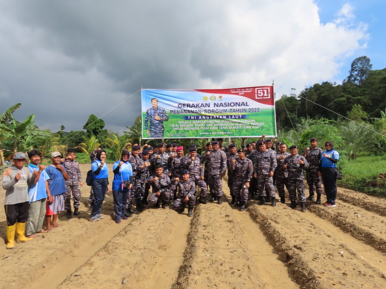 Dinastinews.com Batam — Komandan Lanal Batam Kolonel Laut (KH) Farid Ma’ruf, S.H., M.H., bersama masyarakat Kampung Tembesi Buton, Kelurahan Kibing, Kecamatan Batu Aji, Kota Batam, laksanakan penanaman benih sorgum pada kegiatan Gerakan Nasional Penanaman Sorgum Tahun 2022 TNI Angkatan Laut dengan mengusung tema “Melalui Gerakan Nasional Penanaman Sorgum, TNI AL Bersama Rakyat Siap Membangun Kejayaan amaritim Untuk Indonesia Pulih Lebih Cepat Bangkit Lebih Kuat”, Jumat (09/09/2022).