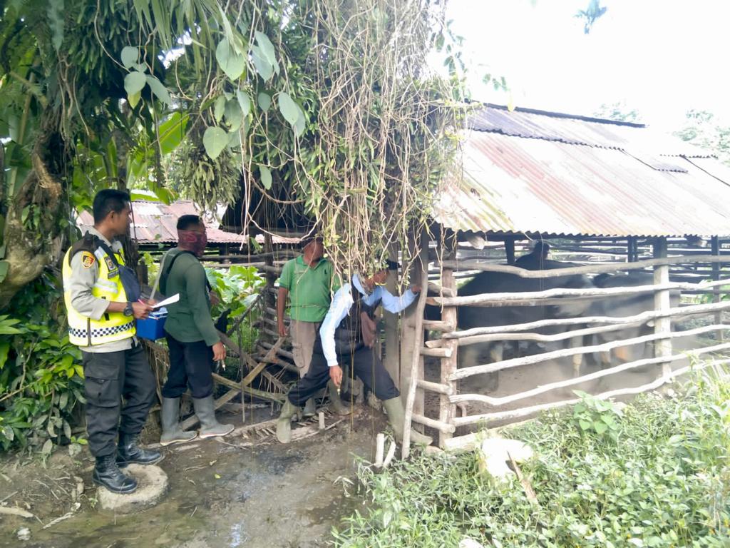 kegiatan diawali memberikan Suntik Vaksin pada Hewan ternak, Tim Vaksin yang didampingi oleh Bhabinkamtibmas blusukan dari satu kandang ke kandang lainnya, selanjutnya Tim bergerak menuju Desa lainnya melakukan hal yang sama memberikan suntikan Vaksin dan Vitamin pada ternak Sapi. (Hasbi)