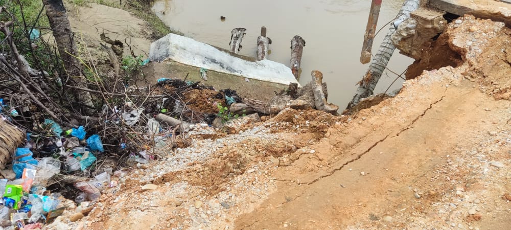 Hal ini tentu sangat membahayakan warga yang melintas bahkan salah seorang warga mengaku sangat takut melintasi jembatan tersebut karna setiap ada yng lewat sedikit demi sedikit tanah tersebut berguguran.