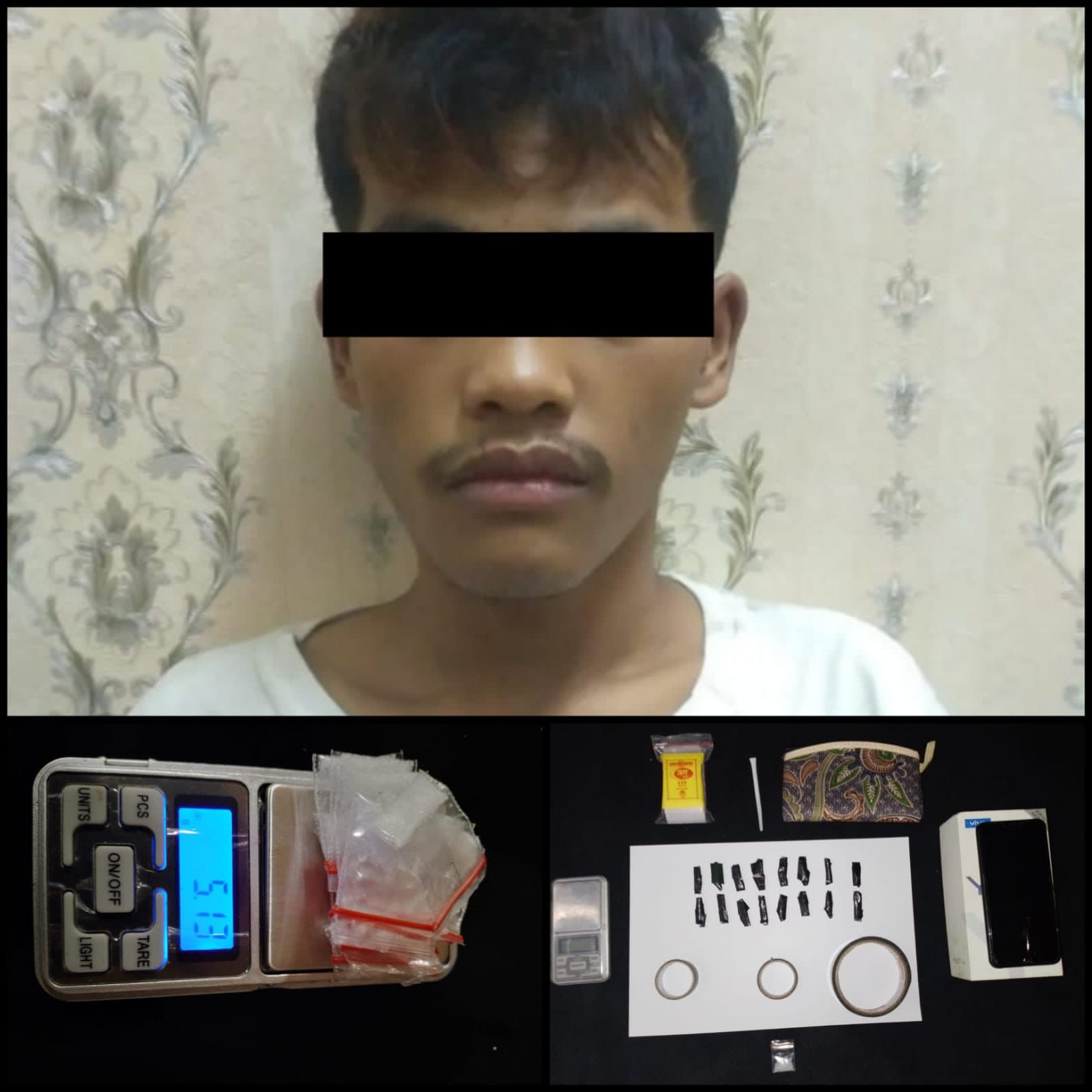 Pada saat dilakukan penggeledahan di temukan barang bukti 17 bungkus plastik klip kecil berisikan Narkotika jenis shabu. “Adapun barang bukti yang ditemukan berupa 1 buah timbangan digital, 2 buah lakban hitam, 1 buah double tape hijau, 1 pack plastik klip bening, 1 buah sendok sedotan, 1 buah box hp, 1 buah dompet kain, dan 1 buah hp android,” ujar Hengki.