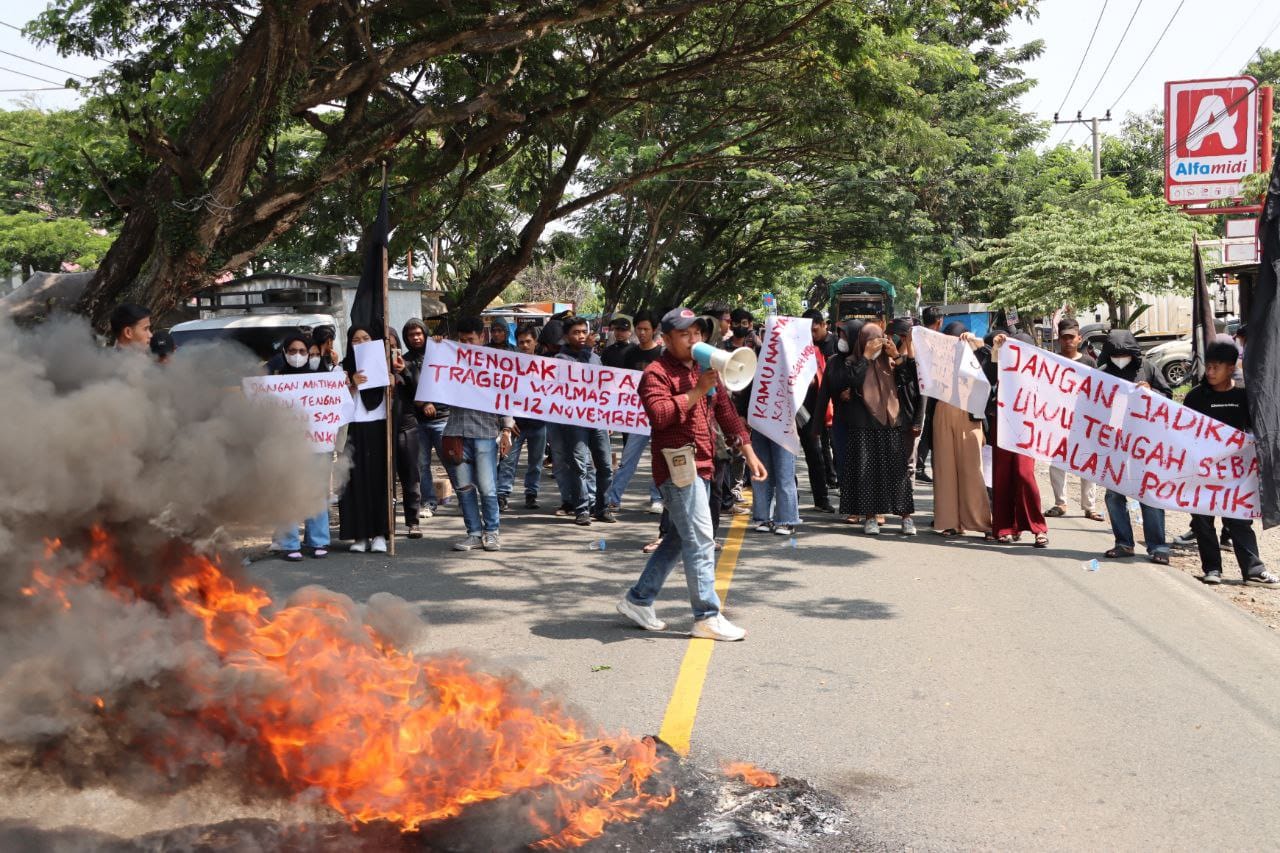 Dalam aksi itu mahasiswa memblokade jalan Trans Sulawesi, membentangkan spanduk dan membakar ban di tengah jalan.