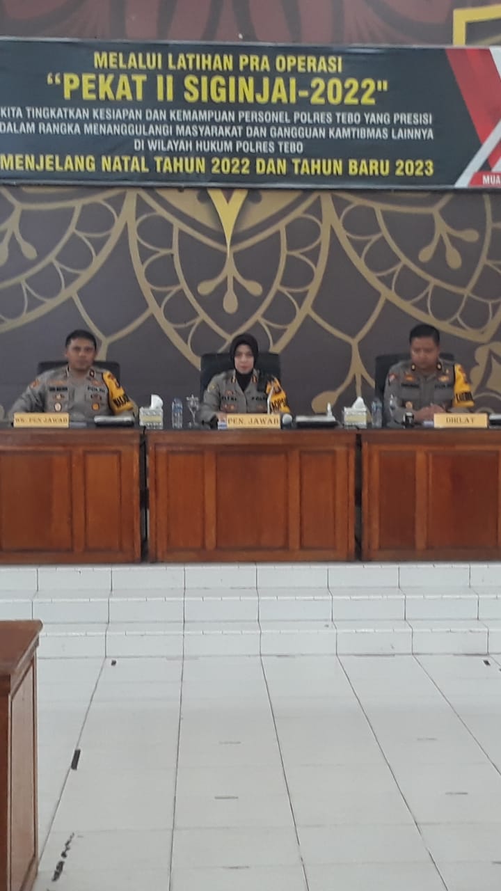 Muara Tebo 14/11/2022 VKapolres Tebo Akbp Fitria Mega.M.Psi.P.si membuka Latihan Pra Operasi Pekat II Siginjai 2022 hari Selasa tanggal 15 November 2022 pukul 09.00 wib tempat Aula Wira Astha Brata Polres Tebo yang dihadiri oleh Waka Polres Tebo Kompol Deni Mulyadi.SE serta para PJU ,Perwira Polres Tebo dan Personil yang terlibat dalam operasi Pekat II Siginjai 2022 sambutan Kapolres Tebo yaitu Anggota Polri bekerja dengan baik sesuai dengan aturan dan tingkatkan kewaspadaan dalam menjalan operasi pekat.II tahun 2022.