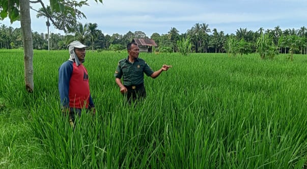 Dinastinews.com Aceh | Kabupaten Aceh Barat Daya (Abdya) | Babinsa Koramil 02/Kuala Batee. Kodim 0110/Abdya, Serda Sukardi mendampingi petani binaan mengecek potensi hama pada tanaman padi yang tengah memasuki reproduktif di Desa Lhung Geulumpang. Kecamatan Kuala Batee. Rabu (23/11/2022).