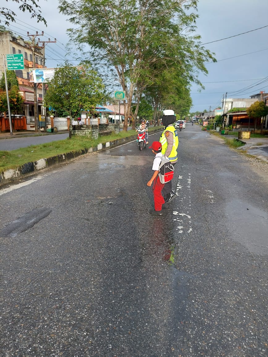 Momen tersebut tampak terlihat saat personel dari Satuan Lalulintas Polres Subulussalam, menyebrangkan anak-anak Sekolah SD Negeri 1 Subulussalam dan pengaturan arus Lalulintas bagi pengguna jalan yang hendak melaksanakan aktivitas.