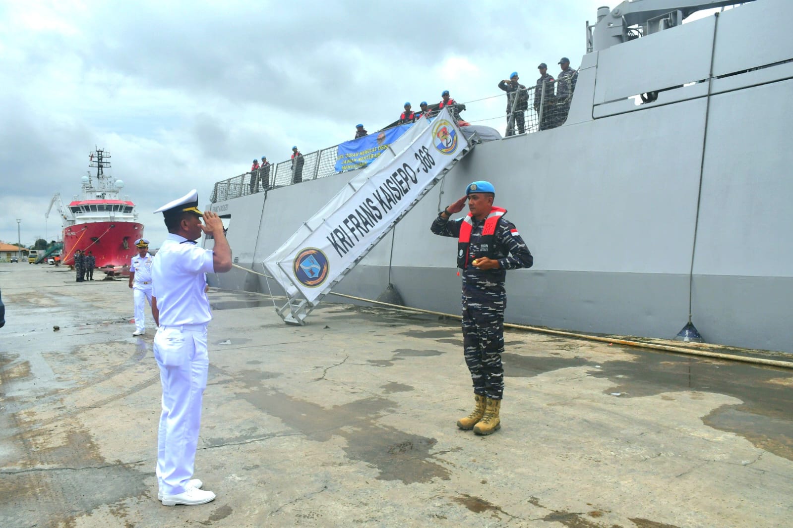 Wadan Lanlantamal I bersama dengan Pejabat Utama Lantamal I membentuk jajar kehormatan saat melepas keberangkatan kapal perang (KRI) sebagai simbol tanda penghormatan kepada KRI Frans Kaisiepo (FKO)-368 yang akan berlayar melaksanakan Satgas MTF tahun ini.