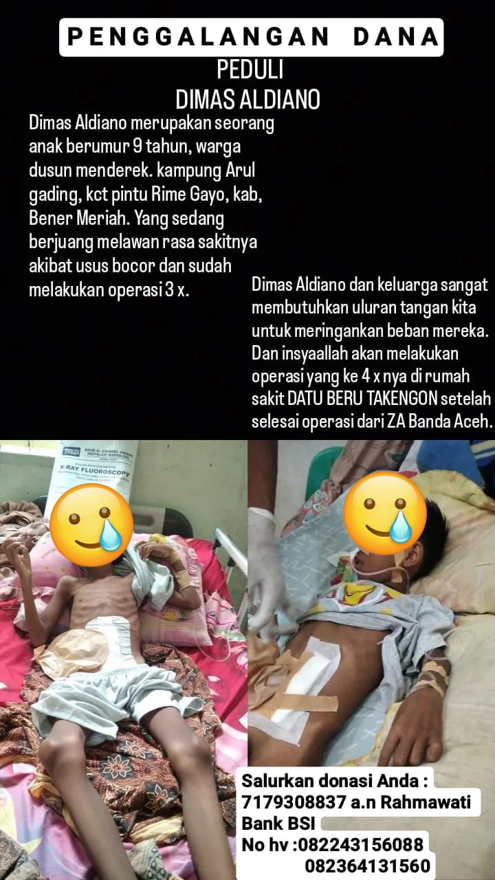 Disini Dimas Aldiano yang lagi berjuang demi kesembuhannya,dari pihak keluarga memohon uluran tangan kita untuk meringankan beban biaya dan InsyaaAllah akan dilaksanakan operasi yang ke empat (4) kalinya di Rumah Sakit Datu Beru Takengon setelah selesai operasi di Rumah Sakit Zainal Abidin Banda Aceh.