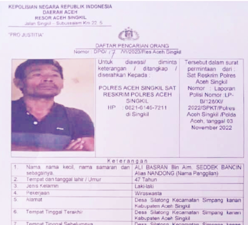 Siapa yang melihat Ali Basran alias Nandong silahkan hubungi Satreskrim Polres Aceh Singkil – Nomor hp 082161467211 []