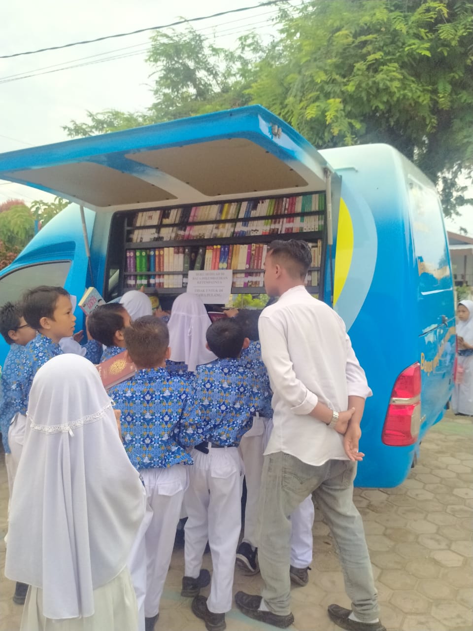 Disekolah SDN 5 Langsa, mobil Perpustakaan keliling yang dikerahkan dinas Perpustakaan dan Kearsipan kota Langsa tampak dikerumuni oleh puluhan pelajar.