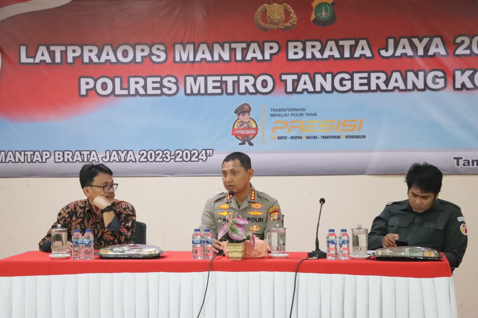KOTA TANGERANG – Kapolres Metro Tangerang Kota, Kombes Pol Zain Dwi Nugroho melaksanakan kegiatan Lat Pra Ops dalam rangka persiapan Operasi Mantap Brata Jaya 2023-2024 di Aula Polres Metro Tangerang Kota, Rabu (11/10/2023).