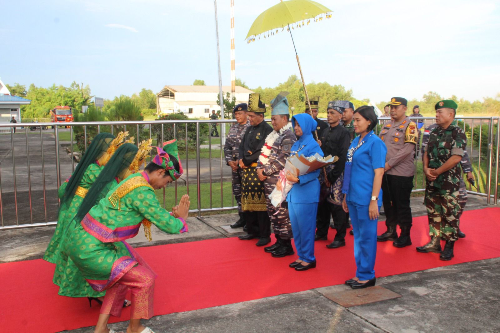 Penyambutan tersebut diawali dengan pengalungan bunga dan pemberian hand bouquet oleh siswa-siswi TK Hang Tuah Perwakilan Dumai, dilanjutkan pemasangan tanjak dan disambut tarian persembahan Sekapur Sirih yang merupakan ucapan selamat datang kepada Pangkoarmada I.