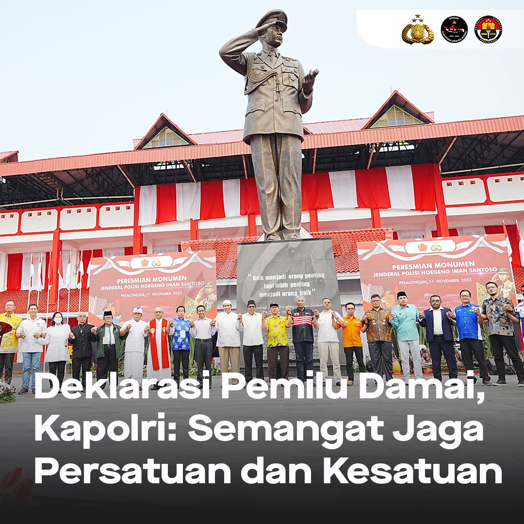 Kapolri Jenderal Polisi Drs. Listyo Sigit Prabowo, M.Si., bersama Panglima TNI Laksamana TNI H. Yudo Margono, S.E., M.M., C.S.F.A., turut mendeklarasikan Pemilu 2024 damai di Pekalongan, Jawa Tengah, Sabtu (11/11). Deklarasi Pemilu damai turut diramaikan oleh oleh penyelenggara Pemilu, serta seluruh lapisan elemen masyarakat. “Dimana kita semua tahu saat ini sedang memasuki tahapan Pemilu untuk memilih presiden dan legislatif di tahun 2024, nanti akan ada Pilkada. Melalui deklarasi ini diharapkan menjadi semangat untuk menjaga persatuan dan kesatuan,” tutur Kapolri saat deklarasi Pemilu damai usai peresmian monumen Jenderal Polisi (Purn) Drs. Hoegeng Iman Santoso. Korps Bhayangkara Netral Hadapi Pemilu (Qomarudin)