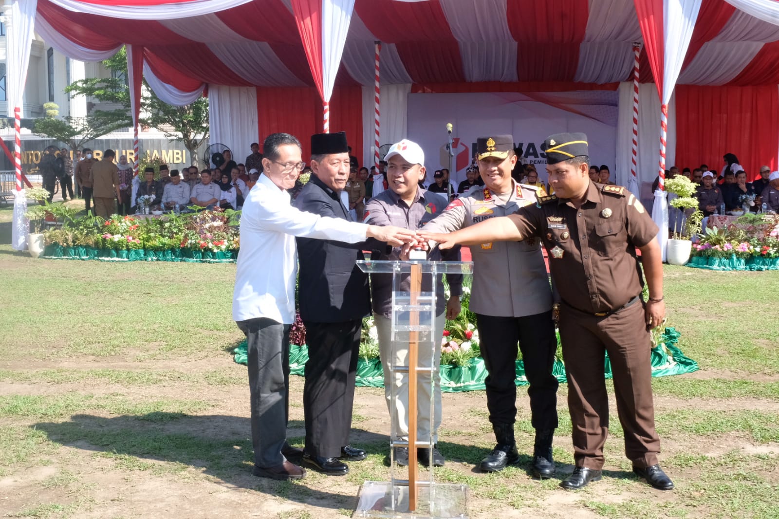 Apel siaga dipimpin Ketua Bawaslu Prov. Jambi Wein Arifin dihadiri Wakil Gubernur Jambi Abdullah Sani, Ketua KPU Prov. Jambi Iron Sahroni, Pj Walikota Jambi Sri Purwaningsih, Pj Bupati Muaro Jambi Bachyuni Deliansyah, Komisioner Bawaslu Provinsi Jambi, Komisioner KPU Provinsi Jambi, Panwascam dan PPKD, Partai Politik Peserta Pemilu, Ormas, OKP, BEM dan SMA serta Toga, Todat dan Tomas.