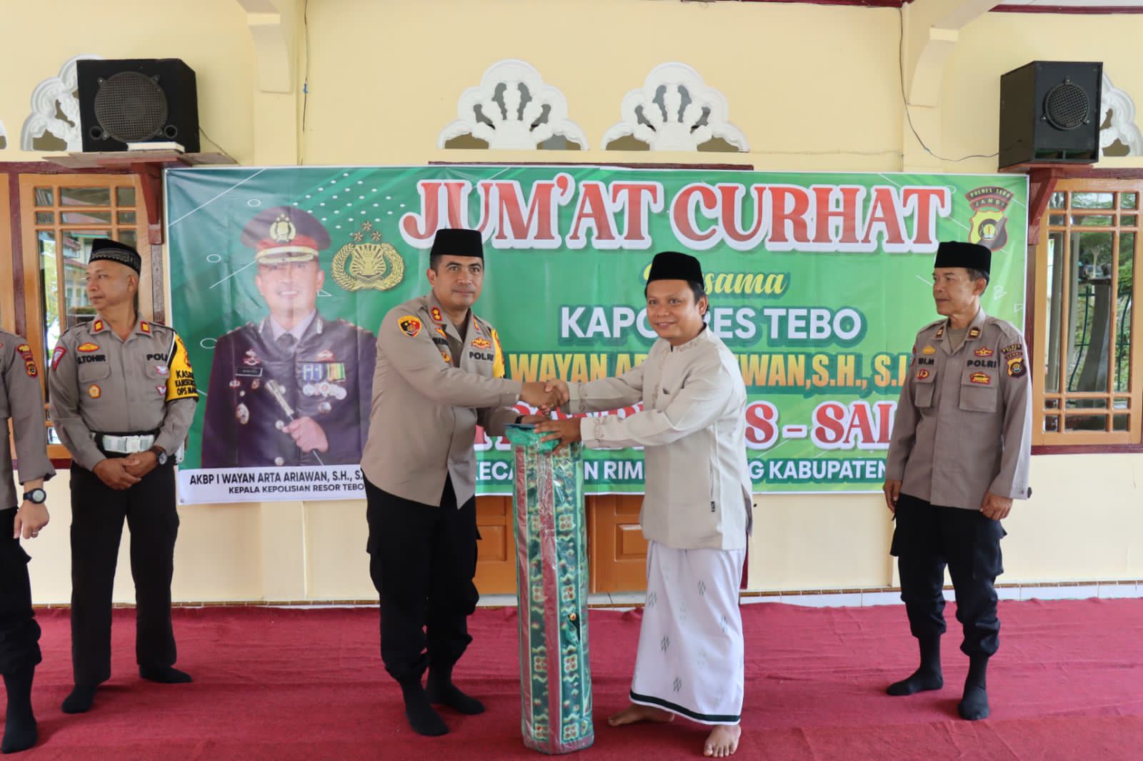 Akhir acara yaitu bantuan dari Kapolres Tebo Kepada Ponpers AS Salam berupa Sambal/karpet masjid.