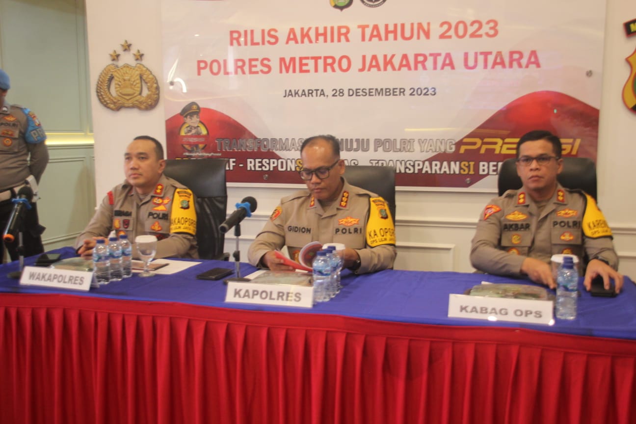 DinastiNews.com Jakarta — Menjelang Akhir tahun 2023,Polres Metro Jakarta Utara menggelar pres rilis akhir tahun yang langsung di pimpin Kapolres Jakarta Utara Kombes Gidion Arif Setyawan didampingi AKBP Wiraga Dimas Tama Wakapolres Jakarta Utara,Kasi Humas Polres Metro Jakarta Utara AKP Ken Rustoko, S.H, dan Kabag OPS AKBP Achmad Akbar, S.I.K., M.Si,Bertempat di Aula Lantai 6 Mapolres Jakarta Utara,Jl. Yos Sudarso No.1 3, RT.1/RW.12, Rawabadak Utara, Kecamatan Koja, Jakarta Utara,Kamis,(28/12/2023).