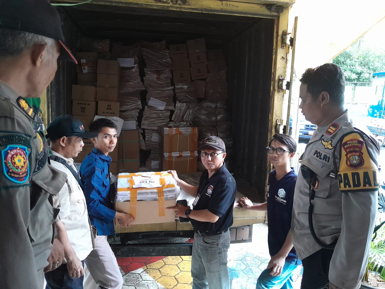 Logistik Pemilu dikirim ke Gudang Logistik Pemilu PPK Kemayoran dengan pengawalan anggota.