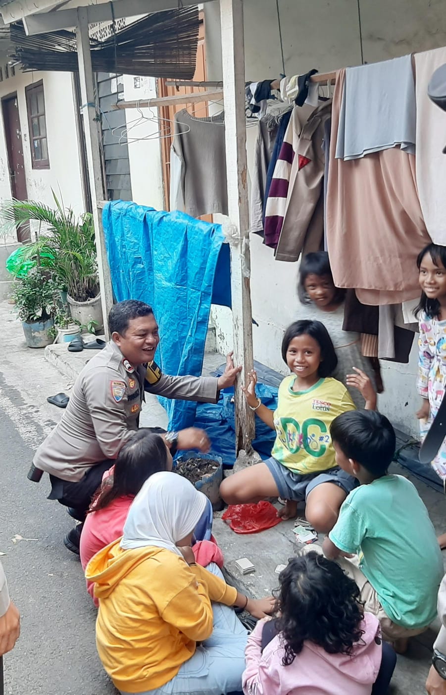 DinastiNews.com Jakarta — Bhabinkamtibmas Kel. Gelora Polsek Metro Tanah Abang AIPTU TEGUH menyambangi anak anak di pemukiman warga Jl Gelora IX D RT 04/02 Kel Gelora Kec Tanah Abang Jakarta Pusat dalam rangka sosialisasi pencegahan kejahatan terhadap anak, pada Senin siang (05/02/2024).