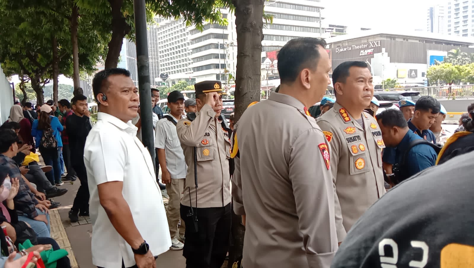 DinastiNews.com Jakarta Pusat — Media Budaya Indonesia.Com – Kasat Narkoba Polres Metro Jakarta Pusat AKBP Iverson Manossoh bersama jajaran personel gabungan Polda Metro Jaya melaksanakan kegiatan pengamanan ratusan massa dan mahasiswa melakukan aksi demonstrasi di depan kantor Bawaslu, pada Senin (19/2/2024). Sebelumnya, massa melakukan longmarch dari Patung Kuda, Jakarta Pusat.
