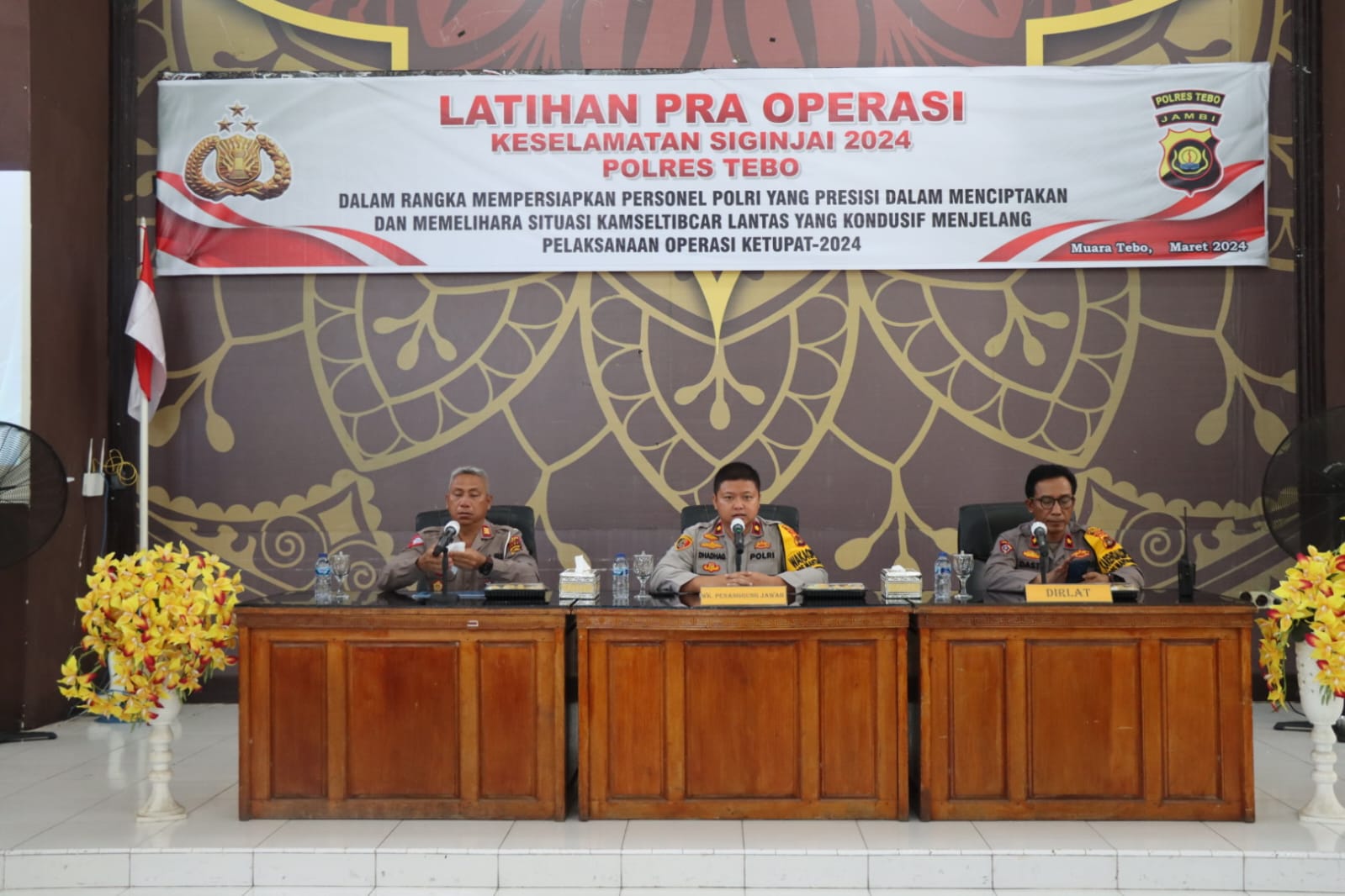Polres Tebo menggelar Latihan Pra Operasi Keselamatan Siginjai 2024 di Aula Wira Astha Brata Polres Tebo, pukul 10.00 WIB, Kegiatan tersebut bertujuan untuk mempersiapkan personel Polri dalam menciptakan dan memelihara situasi Kamseltibcar Lantas yang kondusif menjelang pelaksanaan operasi Ketupat 2024