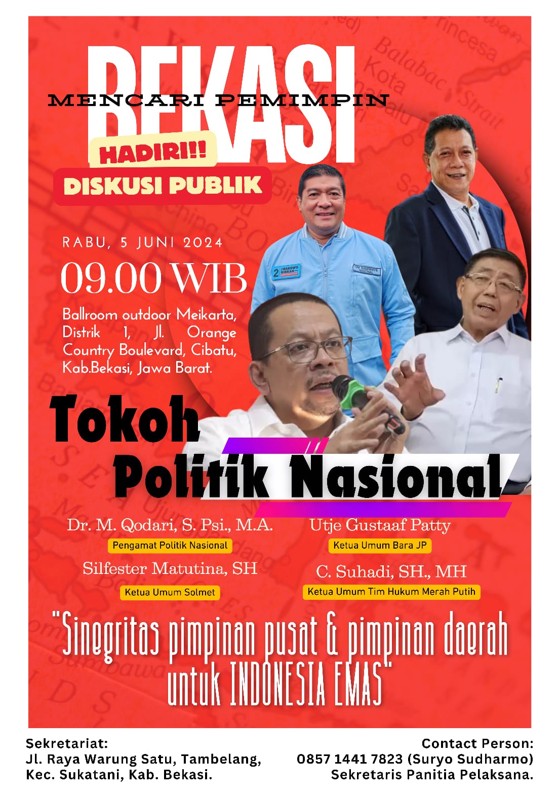 Dinastinews.com Jakarta — Gelaran Kegiatan Bekasi Mencari Pemimpin, yang akan dilaksanakan di Meikarta Distric 1 Cikarang Pusat, pada tanggal 5 Juni 2024 mendatang, adalah salah satu gagasan dari tim Aliansi Wartawan Indonesia Bangkit Bersama (AWIBB) DPD Jawa Barat bersama Tim Hukum Merah Putih (THMP), Senin (27/05/2024).