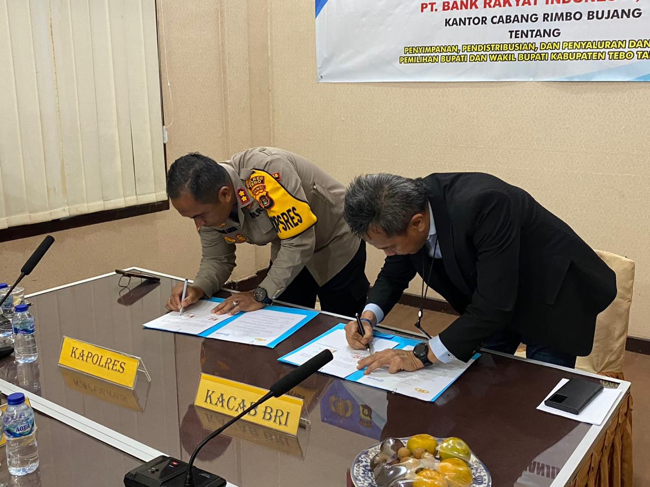 bertempat di Ruang vicon Polres Tebo, dilaksanakan penandatanganan perjanjian kerja sama antara Polres Tebo dengan PT. Bank Rakyat Indonesia (BRI) Kantor Cabang Rimbo Bujang. Perjanjian ini berfokus pada penyimpanan, pendistribusian, dan penyaluran dana hibah untuk pemilihan Bupati dan Wakil Bupati Kabupaten Tebo tahun 2024, Jum’at(19/07/2024).