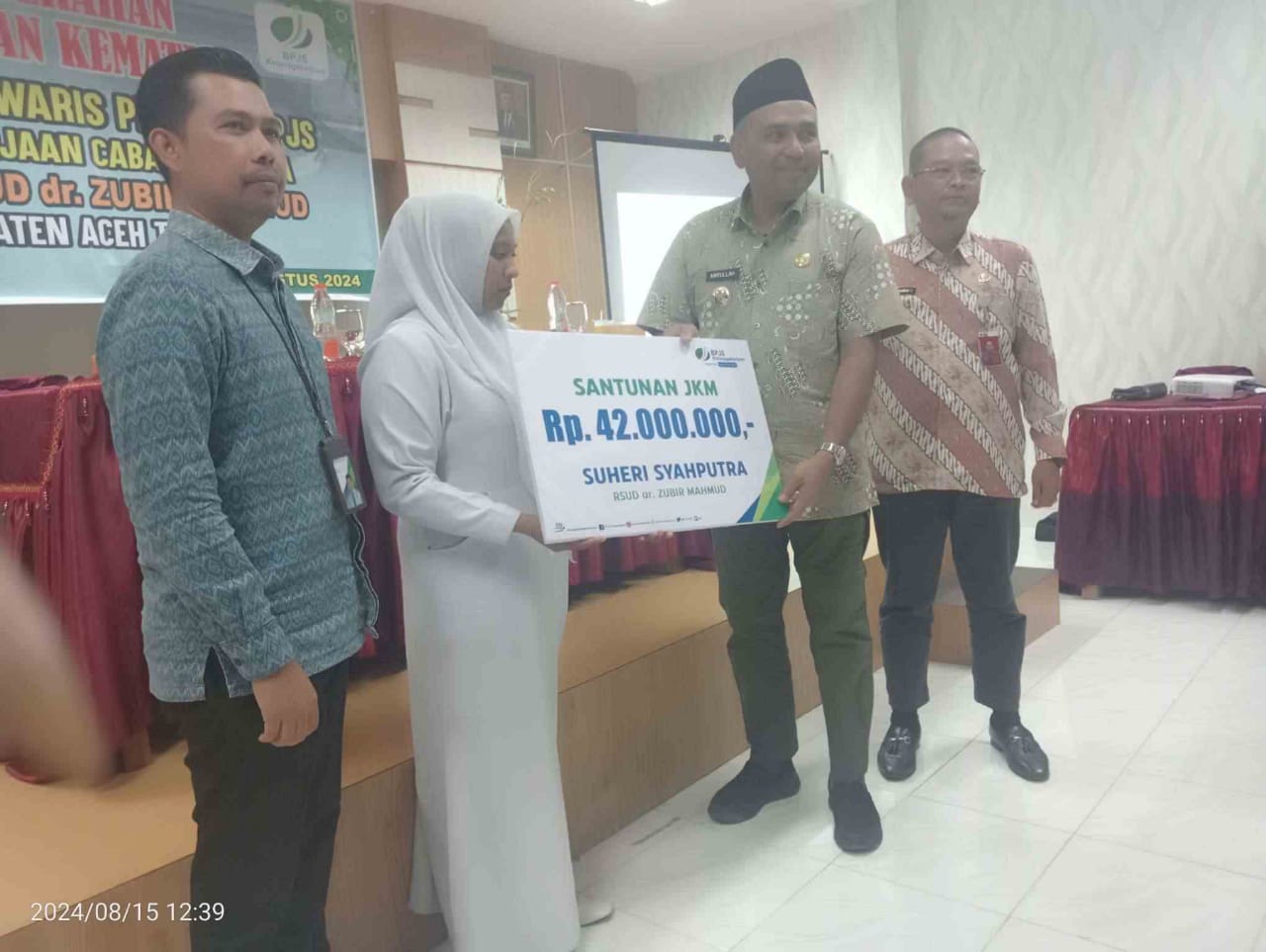 Penyerahan santunan Kematian secara simbolis diserahkan langsung oleh Pj Bupati Aceh Timur Amrullah M Ridha didampingi oleh Direktur RSUD ZM dr. Edi Gunawan,Mars serta Kepala BPJS Ketenagakerjaan Cabang Langsa diwakili oleh Kepala Bidang Kepesertaan Safarullah.