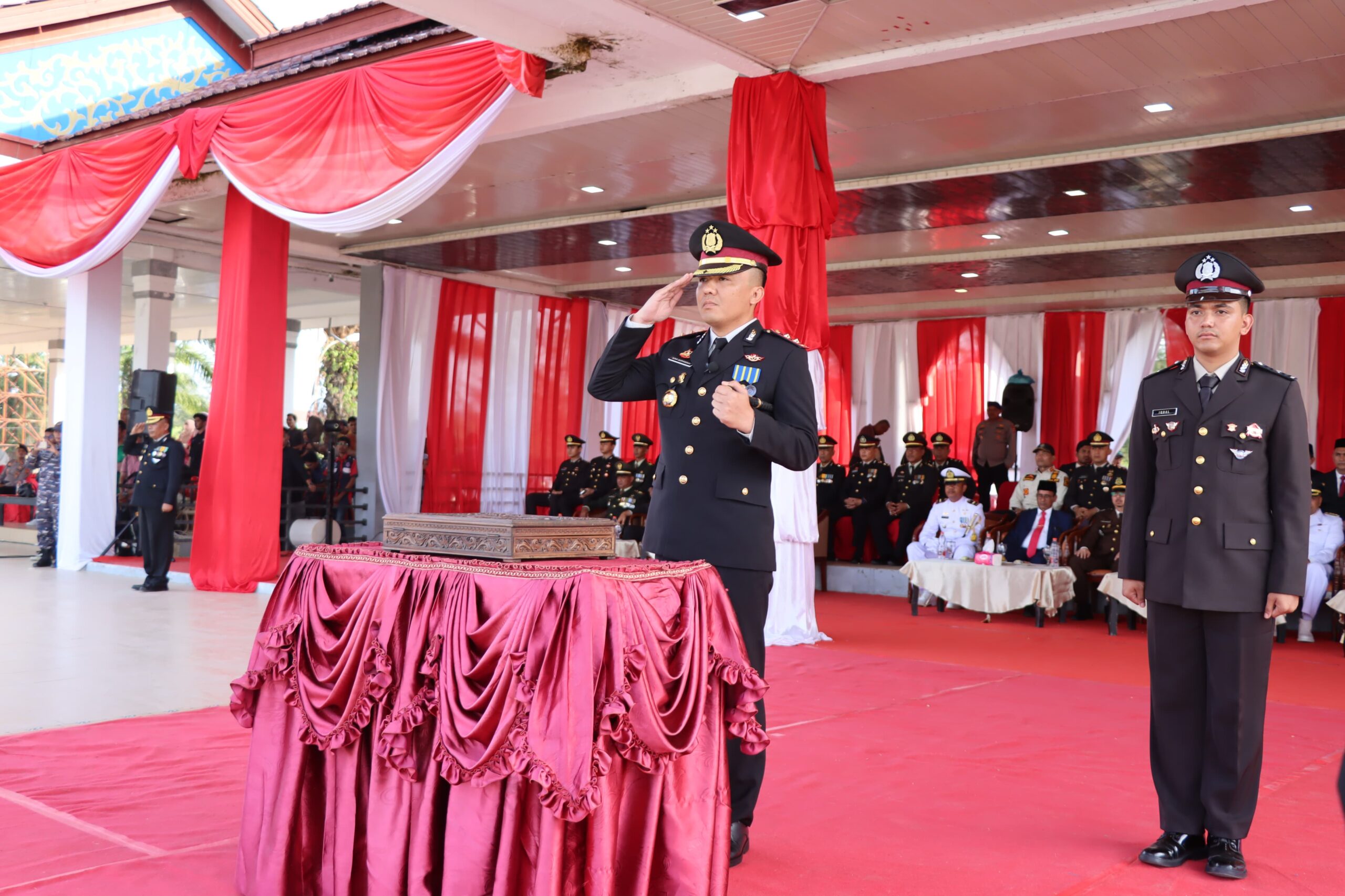 Kapolres Aceh Timur, Polda Aceh AKBP Nova Suryandaru, S.I.K. menjadi inspektur upacara penurunan bendera merah putih peringatan HUT Ke-79 Kemerdekaan Republik Indonesia. Sedangkan Kabag Ops Kompol Surya Purba, S.H.,M.H. bertindak sebagai perwira upacara dan Plt. Kasubbagdalops Iptu Munawir, HRD.,S.K.M. sebagai komandan upacara.