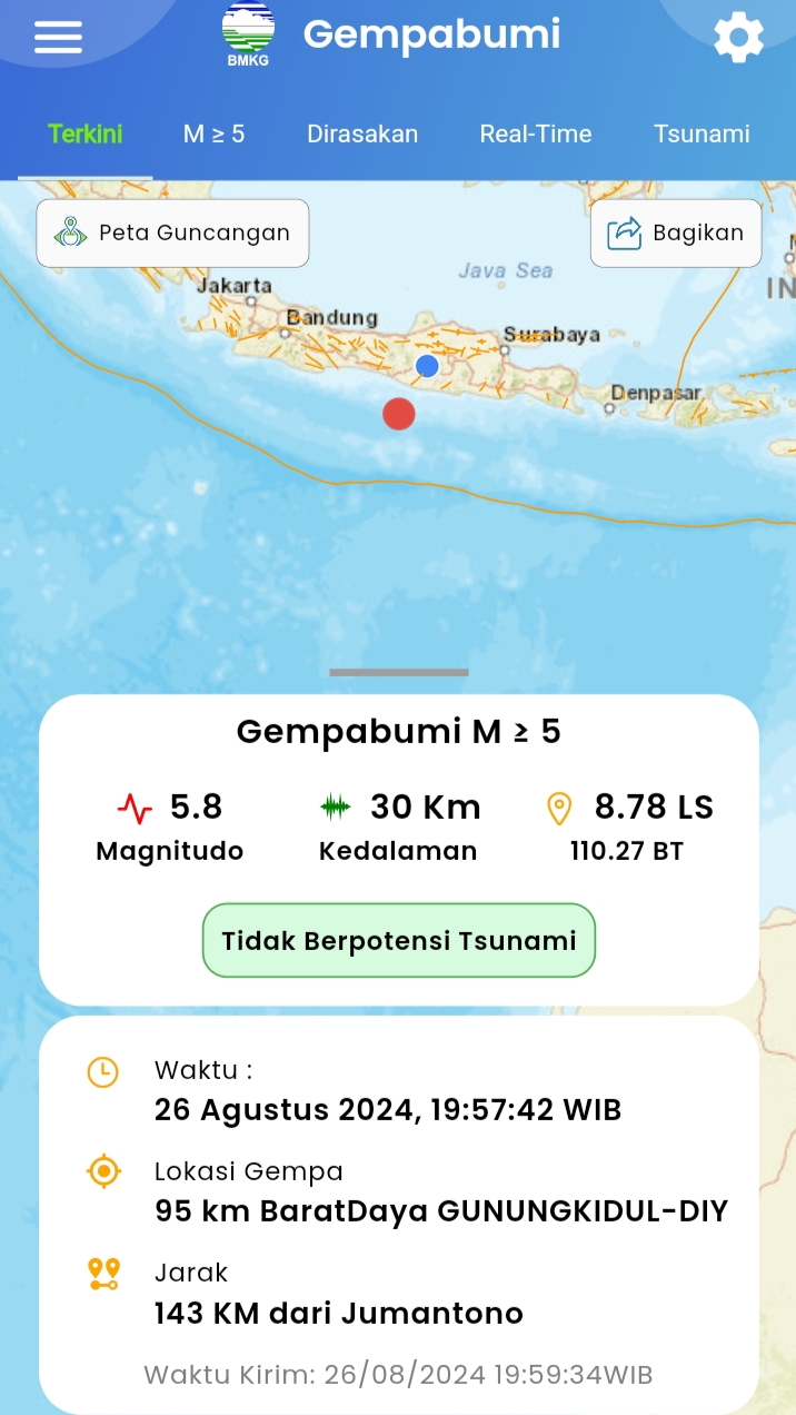 DINASTINEWS.COM , SUKOHARJO Hari ini, Senin, 26 Agustus 2024, jam 19:57 gempa dengan magnitudo 6,0 mengguncang wilayah Yogyakarta dan sekitarnya. Pusat gempa berada di selatan Yogyakarta dengan kedalaman sekitar 10 km. Getaran gempa ini dirasakan cukup kuat di Kota Yogyakarta (skala V MMI) dan juga terasa hingga ke beberapa wilayah lain seperti Semarang, Jepara, Ponorogo, Karangkates, Nganjuk, dan Madiun, dengan intensitas yang bervariasi
