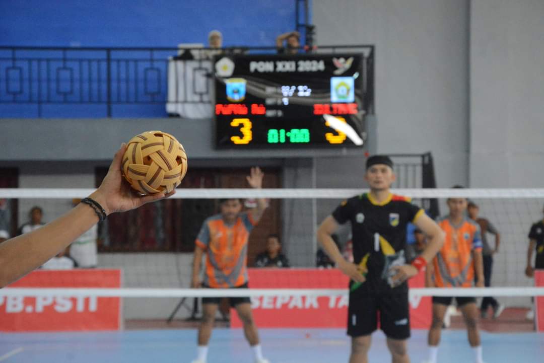 IDI RAYEUK—Pertandingan Cabang Sepak Takraw PON XII Aceh-Sumut hari pertama yang berlangsung di venue Lapangan Takraw Idi Sport Center , Idi , Kabupaten Aceh Timur berlangsung tertib dan lancar, 7 Semptember 2024.