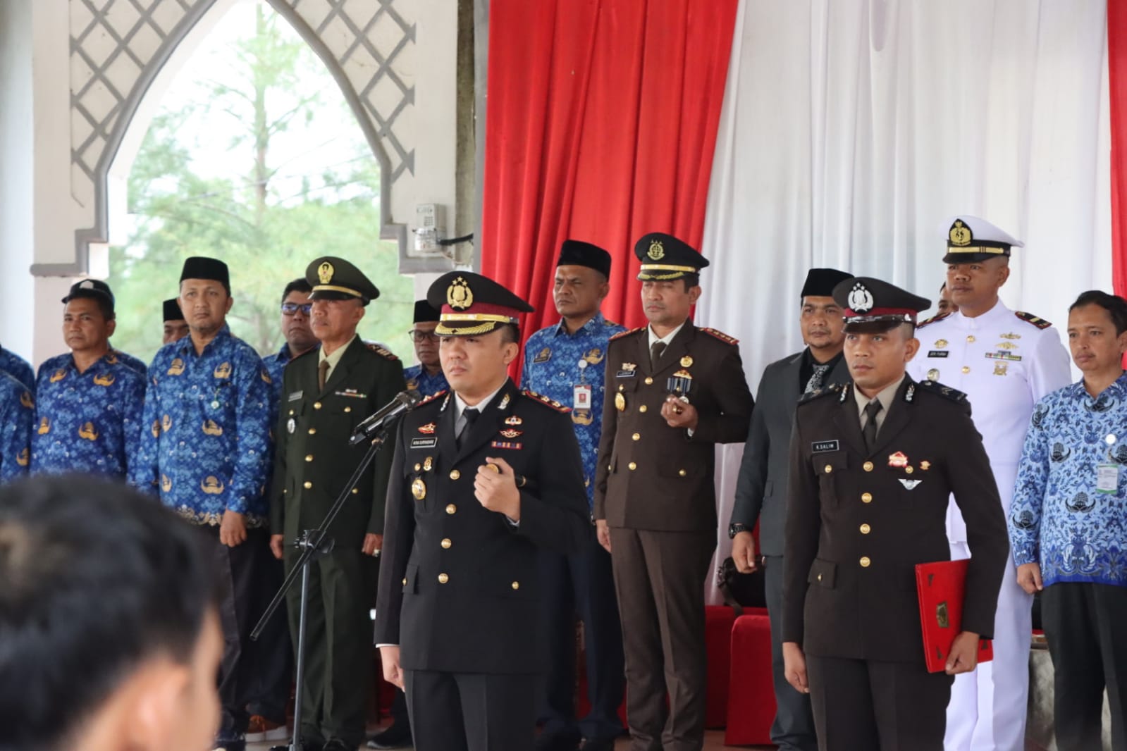 Upacara berlangsung di tribun Lapangan Upacara Pemkab Aceh Timur dihadiri oleh Forkopimda, Wakapolres Kompol Iswar, S.H., pejabat utama Polres Aceh Timur dan tamu undangan lainnya berlangsung khidmat.