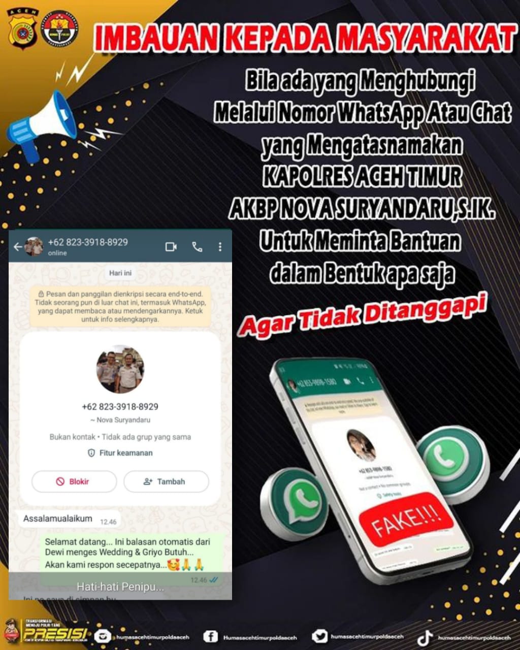 Beredar sebuah akun WhatsApp yang mengatasnamakan Kapolres Aceh Timur, Polda Aceh AKBP Nova Suryandaru, S.I.K. dengan menggunakan nomor +62 823-3918-8929.