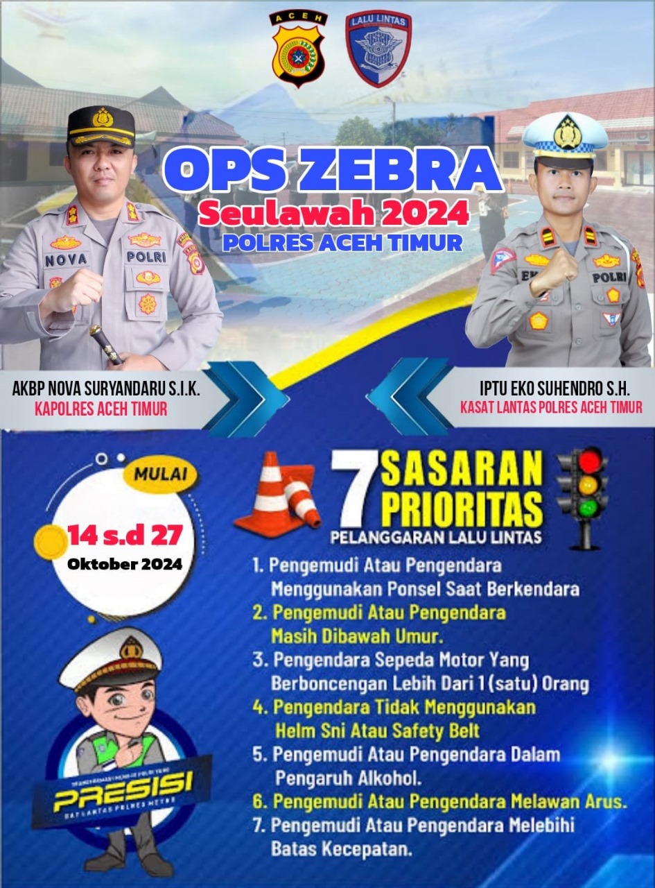 “Kita berharap melalui Operasi Zebra Seulawah 2024 ini mampu meningkatnya disiplin masyarakat dalam berlalu lintas di jalan raya, meminimalisasi pelanggaran, menurunnya tingkat fatalitas korban kecelakaan lalu lintas, serta meningkatnya kepercayaan masyarakat terhadap Polri dengan terbentuknya opini positif dan citra tertib dalam berlalu lintas.” Terang Kasat Lantas Polres Aceh Timur Iptu Eko Suhendro, S.H.