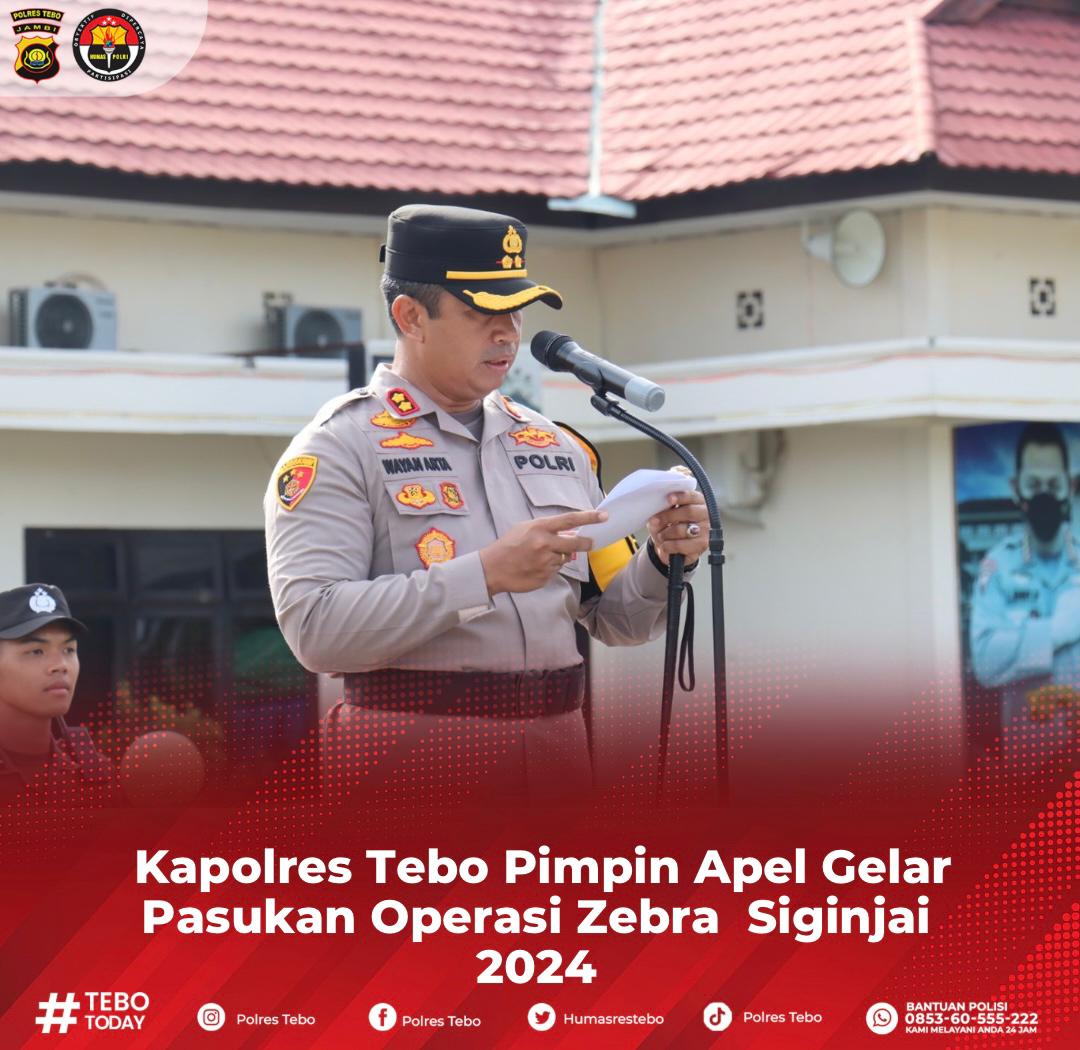Apel Gelar Pasukan Operasi Zebra Siginjai 2024 yang dipimpin oleh Kapolres Tebo AKBP Dr. I Wayan Arta Ariawan, S.H., S.I.K., M.H. Kegiatan tersebut diikuti oleh berbagai unsur Forkopimda Kabupaten Tebo serta personel gabungan dari Polri, TNI, Dishub, Sat Pol PP, dan tenaga kesehatan, Senin(14/10/2024).