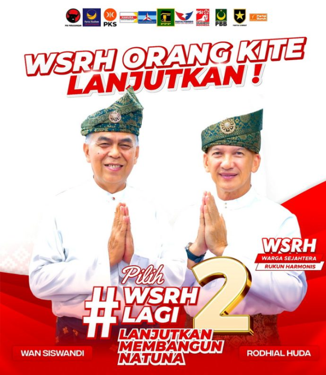 Dinastinews.com|Natuna Pasangan petahana Calon Bupati dan Wakil Bupati Natuna, Wan Siswandi dan Rodhial Huda (WSRH), kembali maju dalam Pilkada Natuna 2024 dengan visi yang kuat untuk melanjutkan pembangunan yang telah dimulai. Dengan slogan WSRH Orang Kite, Lanjutkan!, mereka membawa program strategis yang mengedepankan kesejahteraan masyarakat serta kemandirian ekonomi berbasis maritim, budaya, dan kreativitas lokal.