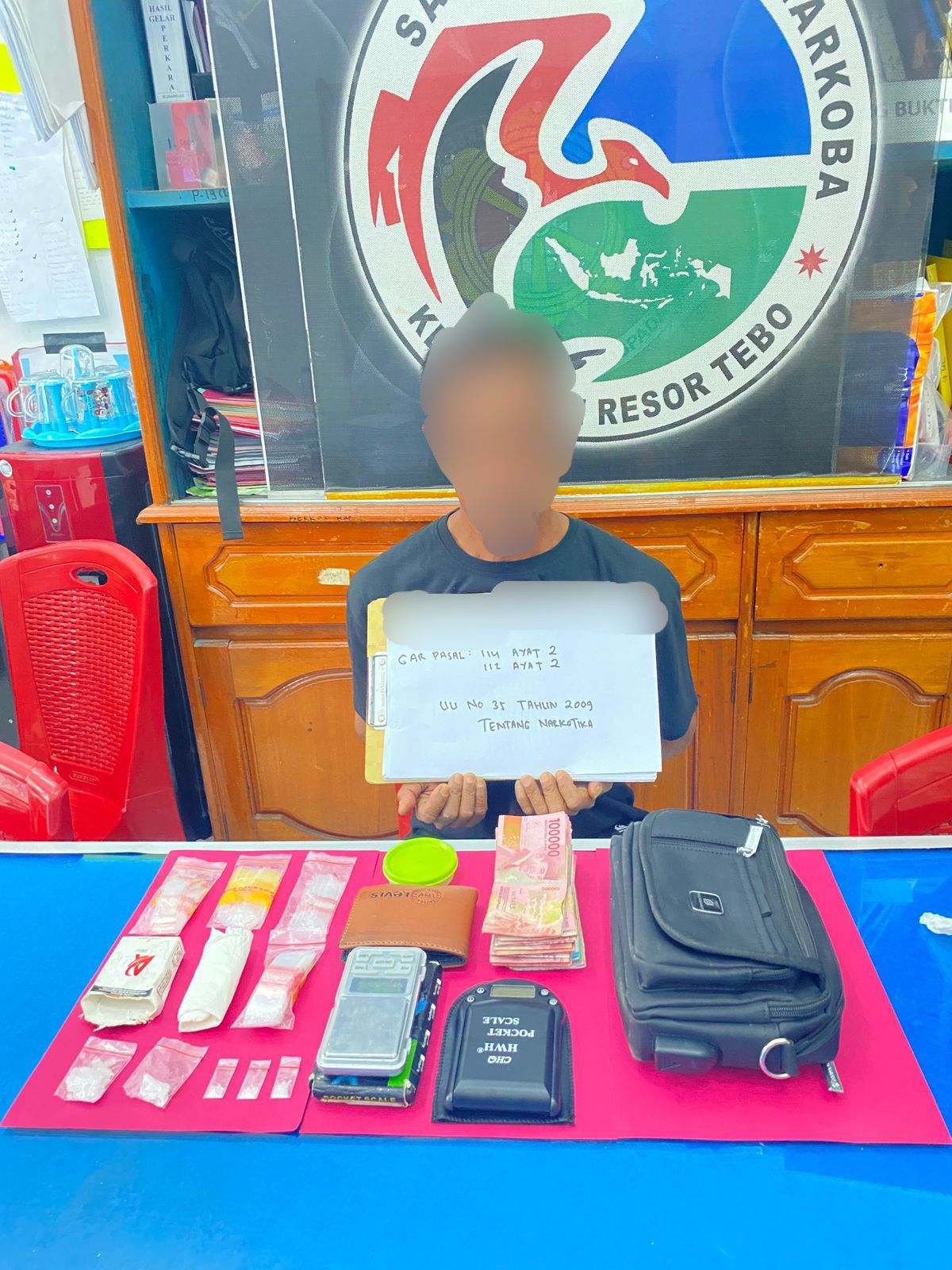 Penangkapan ini dilakukan terhadap tersangka TK(56), Dalam penangkapan tersebut, tim berhasil mengamankan barang bukti berupa Narkotika jenis Sabu yg tediri dari 1 paket sedang dan 4 paket kecil sabu-sabu dengan total berat bruto 6,2 gram, 4 pak plastik klip baru, 2 unit timbangan digital, 1 lembar tisu, 1 kotak rokok, 1 toples kecil, 1 dompet kulit warna coklat, dan 1 tas pinggang warna hitam, berikut uang tunai total sejumlah Rp.11.261.000,- merupakan uang hasil penjualan Sabu
