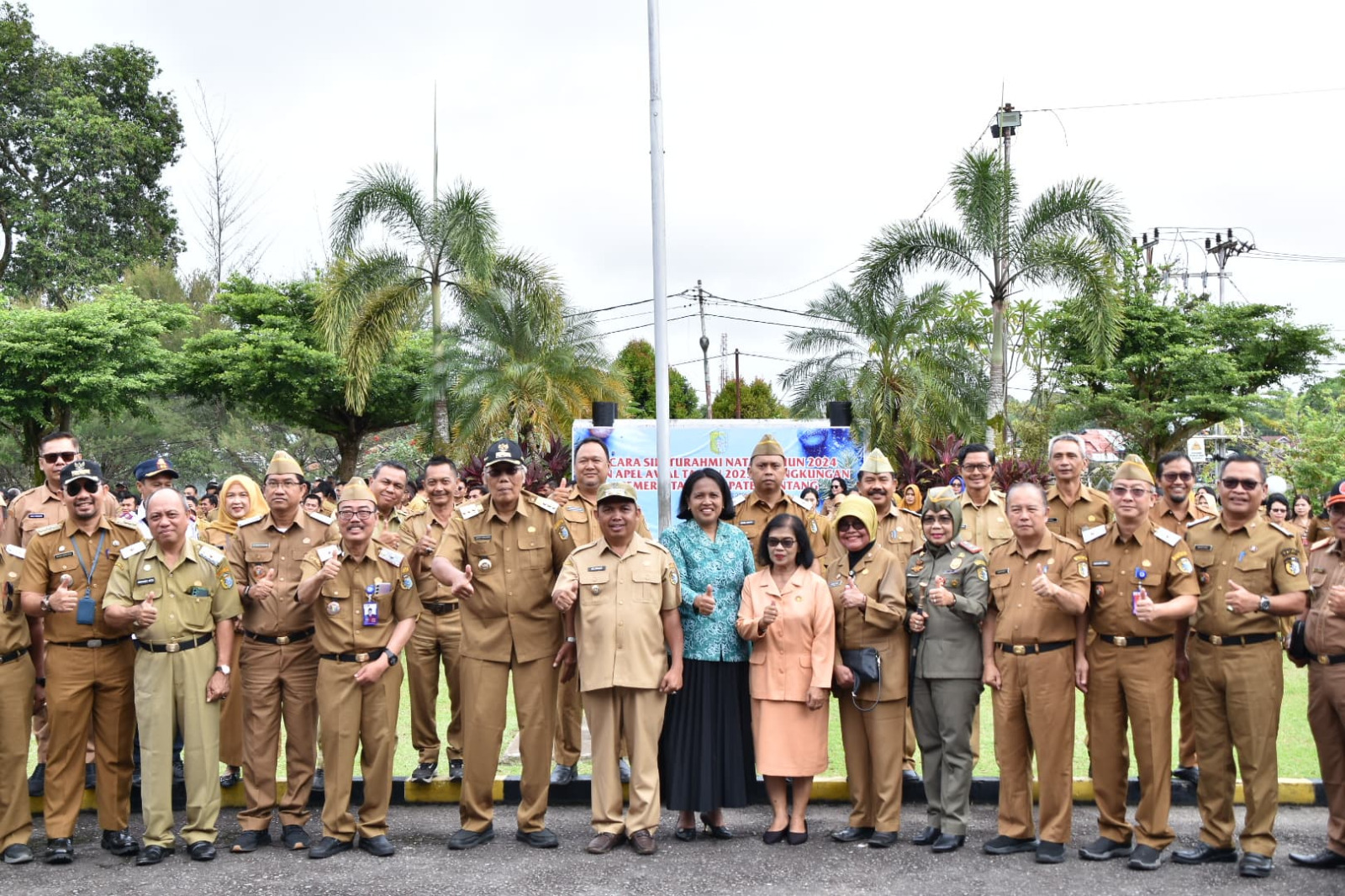Usai pelaksanaan apel awal Tahun 2025, Bupati Sintang, Wakil Bupati Sintang, Sekretaris Daerah Kabupaten Sintang, dan Ketua TP PKK Kabupaten Sintang disalami oleh peserta apel awal tahun 2025.