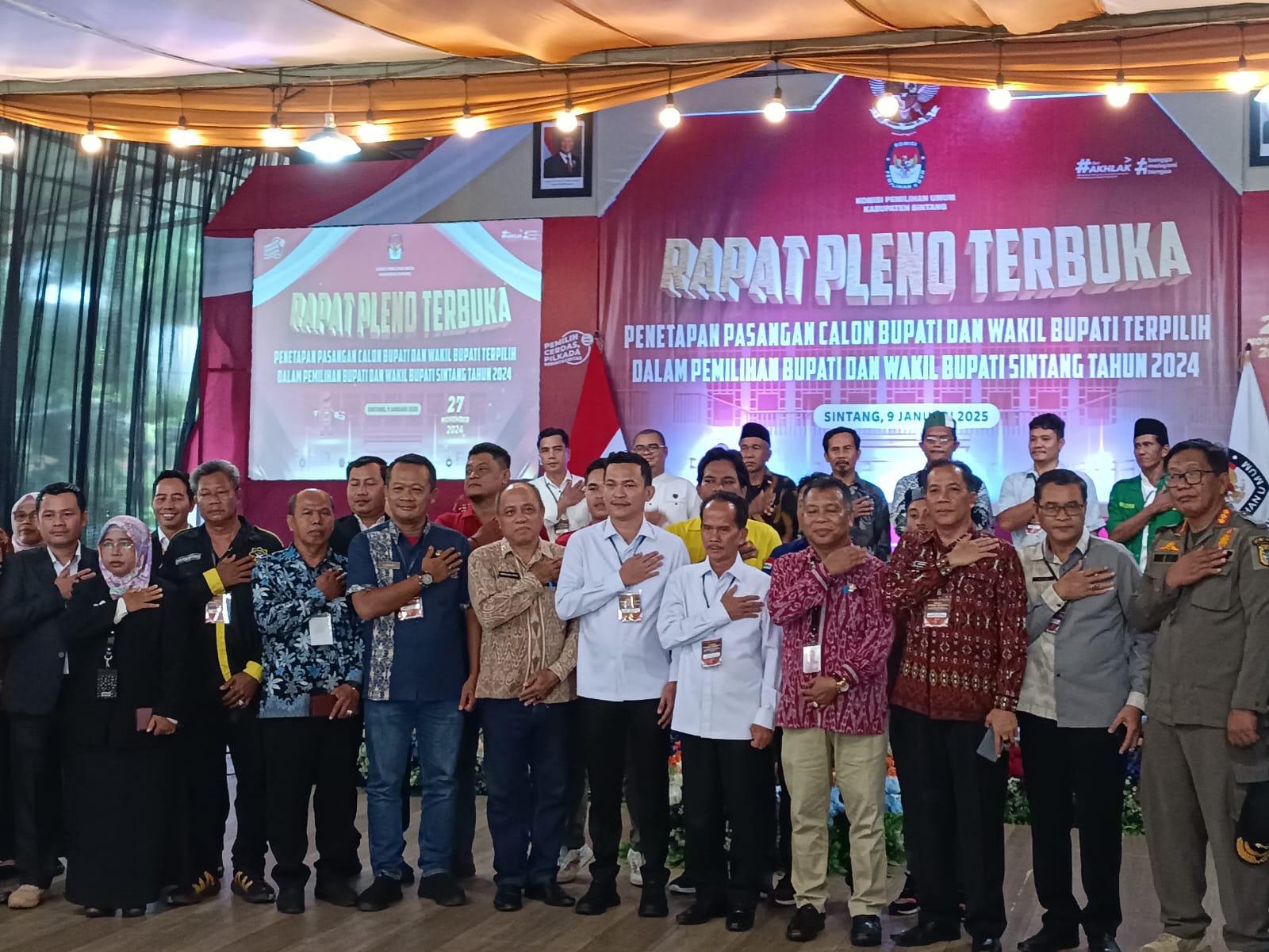 Dinastinews.com – Sintang. Komisi Pemilihan Umum Kabupaten Sintang melaksanakan Rapat Pleno Terbuka dengan agenda Penetapan Pasangan Calon Bupati dan Wakil Bupati Terpilih dalam Pemilihan Bupati dan Wakil Bupati Sintang Tahun 2024 di Aula Serantung Waterpark Jalan Mungguk Serantung pada Kamis, 9 Januari 2025.